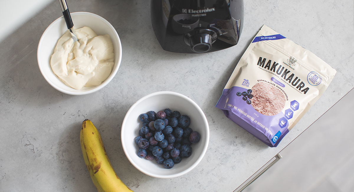 Puuron lisäksi Makukaura sopii hyvin esimerkiksi tuorepuuroon, jogurttiin tai smoothien sekaan. Anniina pääsi testaamaan Makukauran omaa mustikkasmoothie-reseptiä.