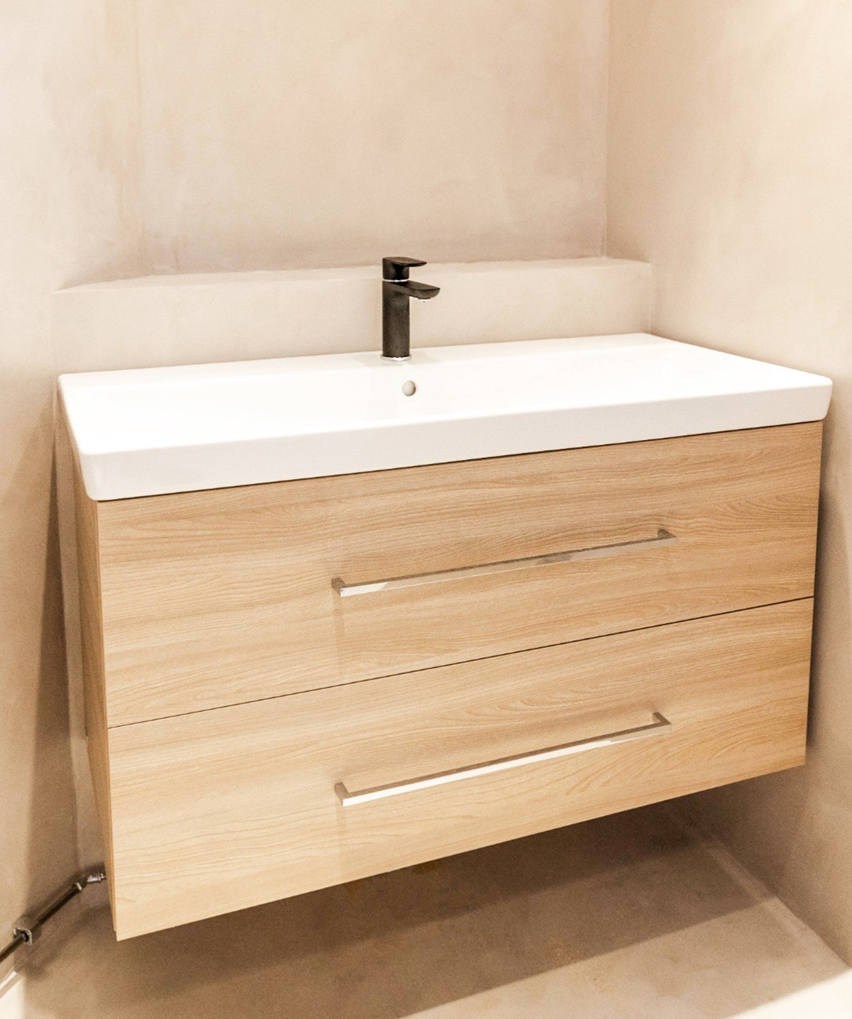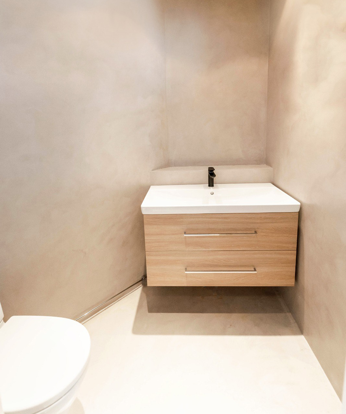 Ennen remonttia tila oli Juhan mukaan vanhan ajan vierasvessa. Mikrosementoinnin avulla tilasta tuli tyylikäs ja laadukas, yhtenäinen skandikylppäri. Juha kiittää ulkonäön lisäksi mikrosementtipintaa myös sen poikkeuksellisesta elävyydestä, se kutsuu koskettamaan.