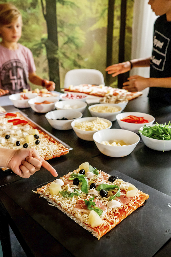 Koko perheen suosikkitäyte on pepperoni ja lapsille maistuvat myös esimerkiksi kinkku ja ananas. Lisäksi juustot ovat aina pizzassa tärkeässä osassa. Aamin mukaan lasten kanssa pizzan tuunaaminen sujuu kätevästi, kun jokaiselle on oma työpiste ja täytteitä on helppo ottaa.