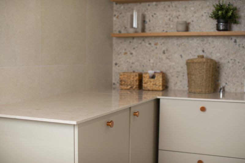 ”Temalin kaapisto on myös maanläheistä gregen sävyistä värimaailmaa, ja olin todella iloinen, että saimme kalusteisiin kuparinsävyiset vetimet.”