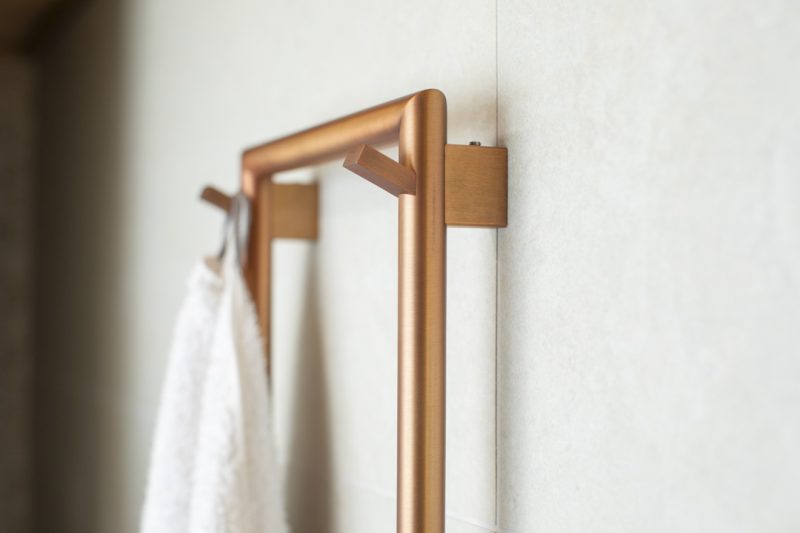 Suvi haki selkeyttä myös muilla valinnoilla. Damixan valikoimasta löytyivät esimerkiksi kuparinen pyyheteline ja pyyhekoukut, joten samat metallinsävyt toistuvat koko kylpyhuoneessa.