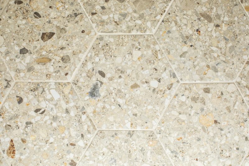 Suvin kylpyhuoneeseen päätyivät lopulta lattiaan ja yhdelle seinistä luonnonkivimäinen kuusikulmainen terrazzo-laatta ja sen pariksi suurikokoinen lämpimän greigen sävyinen seinälaatta.