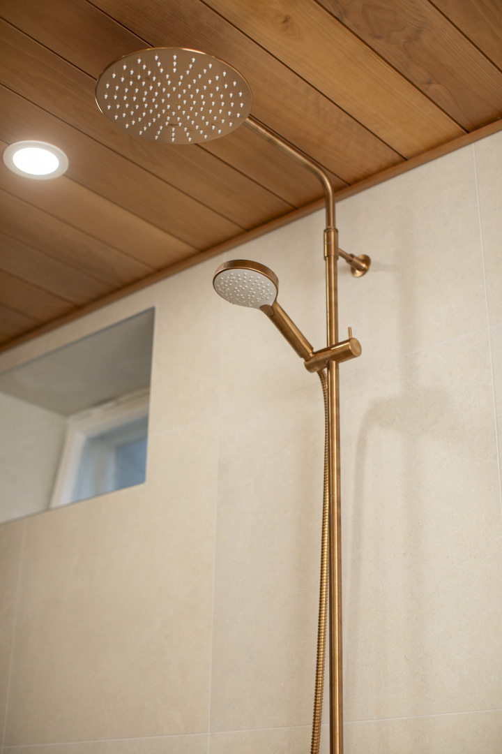 Suville oli tärkeää, että laatat sointuivat yhteen jo valittujen kuparisten yksityiskohtien, kuten kuparinsävyisen Damixan suihkun kanssa.