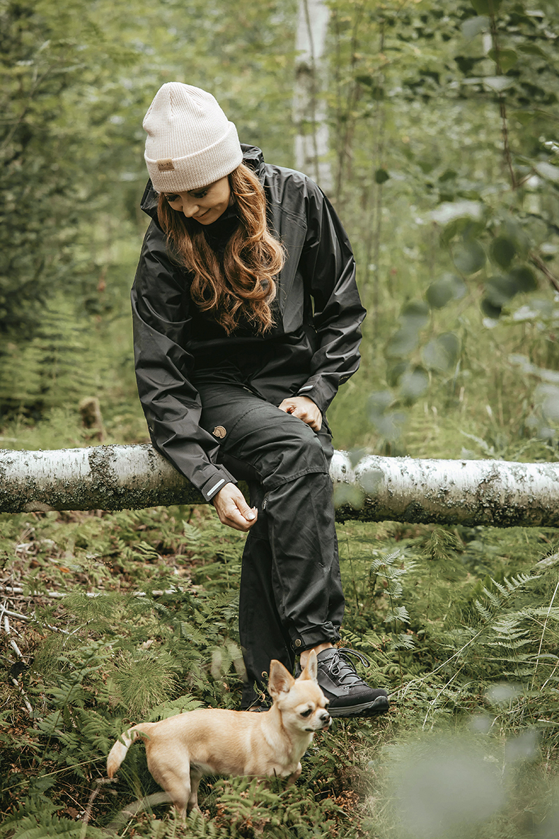 Housuissa on huomioitu myös metsäretkeilyssä tärkeä liikkumisen vapaus. Fjällräveniltä löytyi myös High Coast Hydratic -kuoritakki, joka on Varpun mielestä pelastus vaihtelevissa säissä. – Kuoritakki on monikäyttöinen ja se päällä ei haittaa, jos kesken lenkin alkaa sataa vettä. Toisaalta viileämmällä kelillä alle voi pukea lämmintä ja olla samalla varautunut siihenkin, että räntää voi pudota niskaan, Varpu kuvailee.